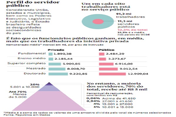 Em julho, a Folha de S.Paulo repercutiu estudo elaborado pelo portal “República.org” sobre vários dados relativos ao funcionalismo público brasileiro. Um desses, são os salários pagos pelo Estado, cuja média recebida por 70% dos servidores varia entre R$ 3.400 e R$ 5 mil. As informações, portanto, jogam por terra o mito de que os servidores públicos brasileiros são “marajás” e desfrutam de “supersalários”.