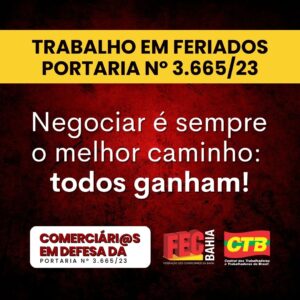 A FEC Bahia conclama os sindicatos baianos e trabalhadores do comércio para entrarem nessa luta importante. Vamos pedir aos deputados e senadores de cada região apoio para que a portaria não seja derrubada. Precisamos mostrar que ela trata exclusivamente da abertura do comércio nos feriados.