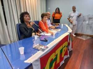 Aladilce Souza [dirigente licenciada do SindisaúdeBA] e Augusto Vasconcelos [presidente licenciado do Sindicato dos Bancários e vereador] ressaltaram a força do movimento sindical na Bahia e necessidade de grandes mobilizações para o enfrentamento à extrema-direita, para ajudar o governo Lula na reconstrução do País e no resgate de direitos que foram eliminados.