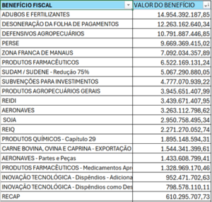 Segundo reportagem da Folha de S. Paulo, ao todo são 43 benefícios tributários listados e entre as empresas campeãs em renúncia constam a Braskem (petroquímica) e o IFood (aplicativo de entrega). A Braskem teve um benefício de R$ 2,27 bilhões via Reiq (Regime Especial da Indústria Química), o que faz a empresa praticamente esgotar sozinha os recursos desse incentivo. Em resposta a Braskem disse ter usufruído somente de R$ 175 milhões.