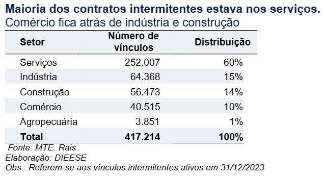 Dados da Relação Anual de Informações Sociais (RAIS), do Ministério do Trabalho e Emprego (MTE), ao final de 2023, havia 417 mil vínculos intermitentes na iniciativa privada, o equivalente a 0,94% do estoque de vínculos formais ativos nesse segmento. A maioria se concentrava no setor de serviços, que registrou a existência de 252 mil intermitentes.