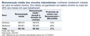 O estudo do Dieese revela que a remuneração mensal média dos vínculos intermitentes ativos no final do ano passado foi de R$ 762, cerca de 42% inferior ao salário mínimo (R$ 1.320, em 2023). Entre as mulheres e os jovens de até 24 anos, a remuneração média foi equivalente à metade do salário mínimo (cerca de R$ 661). Apenas 24% dos vínculos intermitentes registrou remuneração média de, pelo menos, um salário mínimo. Apenas 6% receberam, em média, dois salários mínimos ou mais. Remuneração dos vínculos intermitentes: 76% dos vínculos não tiveram remuneração ou receberam valor inferior a um salário mínimo.