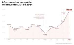 Em 2024, foram 3,5 milhões pedidos de licença no INSS motivados por várias doenças. Cerca de 472 mil solicitações foram atendidas por questões de saúde mental. Em 2023, foram 283 mil benefícios, representando um aumento de 68% e um marco na série histórica dos últimos 10 anos.