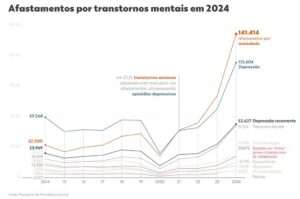 Se o mercado de trabalho apresenta bons números, com a geração de 3,1 milhões de empregos em dois anos e o menor índice de desemprego em 12 anos (6,6%), a saúde mental dos trabalhadores está em perigo. Dados do Ministério da Previdência Social sobre afastamentos do trabalho mostram que, em 2024, houve o maior número em, pelo menos, dez anos.
