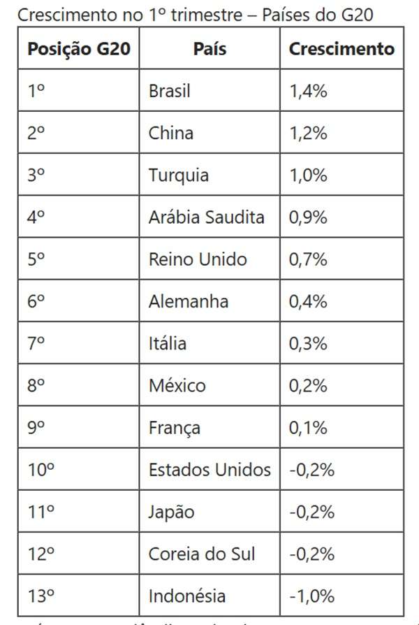 Esse índice fez o Brasil obter o maior crescimento entre as 20 maiores economias do mundo, segundo levantamento global feito pela revista Exame. O PIB do país cresceu mais do que todas as outras nações que forma o G20, que divulgaram seus dados oficiais até o momento.