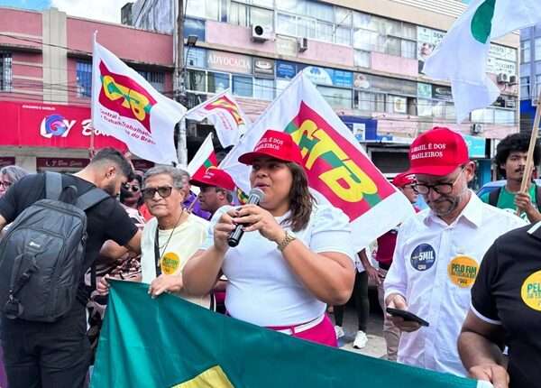 Presidenta do Sindicato, Amanda Santos reafirmou o compromisso da entidade por soberania, justiça social e valorização da classe trabalhadora. “Este ato é uma resposta coletiva à tentativa de tutela estrangeira sobre o Brasil. Também é um chamado para que o povo participe do Plebiscito Popular e diga com força: queremos o fim da jornada 6×1, queremos que os ricos paguem mais impostos, e não os trabalhadores que já estão sobrecarregados”, destacou.
