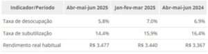 Essa taxa de desemprego (5,8%) caiu 1,2% em relação ao trimestre anterior, encerrado em março, que foi de 7%. No mesmo trimestre de 2024, a taxa era de 6,9%. O número absoluto da população desocupada recuou para 6,3 milhões, ou seja, menos 1,3 milhão de pessoas desempregadas no trimestre.