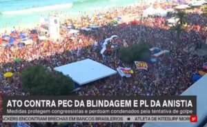Rosa de Souza aponta os próximos passos da luta. “A pressão deve continuar com novos atos, para o Senado corrigir o absurdo da Câmara Federal e enterrar, de vez, a PEC da Blindagem, e o projeto de anistia para os golpistas. Mas, isso tem que ser feito sem esquecer as bandeiras pelo fim da escala 6×1, isenção de Imposto de Renda até R$ 5 mil e taxação dos super-ricos”, pontua.