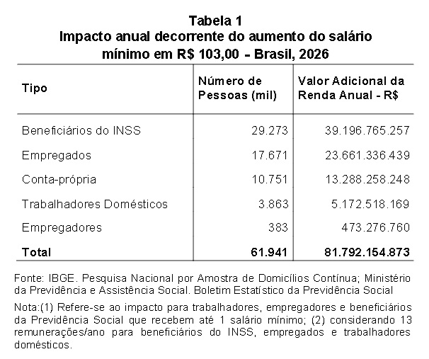 Esse montante considera o aumento direto na renda das famílias, o estímulo ao consumo e o consequente incremento na arrecadação tributária. Cerca de 61,9 milhões de pessoas serão contempladas, incluindo 29,3 milhões de aposentados e pensionistas do INSS, 17,7 milhões de trabalhadores com carteira assinada, 10,7 milhões de autônomos e quase 4 milhões de empregados domésticos.
