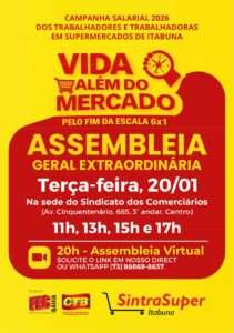 O SintraSuper de Itabuna vai iniciar a Campanha Salarial 2026 no setor de supermercados na terça-feira (20/01). A entidade convoca assembleias presenciais (11h, 13h, 15h e 17h) e uma assembleia virtual (20h), para ter uma boa participação dos trabalhadores e das trabalhadoras.